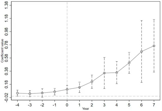 Table 4 reports the baseline regression results of Equation (1). First, without adding control variables, column (1) shows that the estimated coefficient of the policy variable (Treated) is 0.396, which is significant at the significance level of 1%; second, column (2) shows that the regression coefficient of Treated is 0.131, which is significant at the 1% level when the control variables are not added but the time and regional effects are controlled; finally, column (3) implies that after controlling other relevant influencing factors, the estimated coefficient of Treated is 0.126, with a significance level of 1%, indicating that the innovation policy pilot of the NIIDZ can significantly promote the growth of urban GTFP, contributing to the green development of the urban economy.