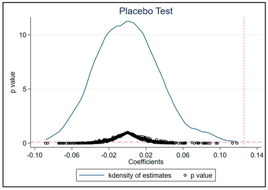 Finally, a placebo test is conducted to help eliminate the impact of unobserved factors. We randomly select the experimental group during pilot years as a research sample and repeat this process 500 times. Figure 3 shows that the estimated values of the coefficients of Treated in the random process are mostly distributed around zero. The estimated coefficient obtained through actual policy assessment is represented by the red vertical dashed line. It is evident that the simulation results based on counterfactuals differ significantly from the actual results. Therefore, it is reasonable to believe that the previous research results are not random but highly reliable.