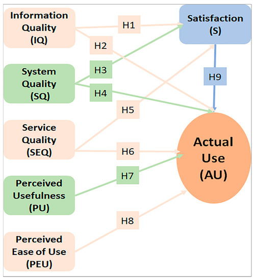 In the sections below, the hypotheses presented in the current study are displayed. The ISSM has been considered to estimate the quality factors affecting actual use, relying on information quality, system quality, service quality, and satisfaction. Meanwhile, TAM was estimated with reference to students’ preferences regarding perceived usefulness, perceived ease of use, and actual use.