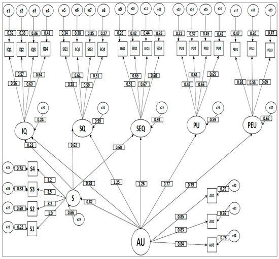 The study results got that the information quality factor has no influence brunt on both satisfaction and AU, which contradicts studies [28,46,59] whose results indicate that providing educational content that meets the factors of completeness, integration, and quality, along with diversity in terms of presentations, tasks, reports, assignments, etc., leads to the creation of more efficient educational content for ubiquitous learning, which ultimately helps achieve satisfaction and wider AU of the system. Alternatively, consistent with the consequences of the current study, Seta et al. [60] showed that the information quality factor does not affect both the satisfaction and the intention to use e-learning systems among higher education students. The current study findings may have been derived as a result of reliance on the selected dimensions of information quality, which were confined to the quality of the learning content and the content design. This highlights the urgent need to periodically poll students about their points of view on the most appropriate dimensions of information quality.