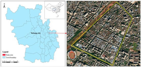 The study area is located in the Dongcheng Subdistrict, Xichang City, China (Figure 1). The Xichang area is a high–risk earthquake region in China, and its fortification intensity is no less than the Chinese seismic intensity IX degree. The Dongcheng Subdistrict, located in southeastern Xichang City, includes six communities. Its total area reaches 7.8 km2. The total population of the Dongcheng Subdistrict was 43,362 persons in 2018. The Han population accounts for 76.76% of the total population. Yi ethnic minorities are the most populous minority in the area, which accounts for approximately 18.05% of the total. Other ethnic minorities account for 5.19% of the total population [50]. The study area selected in this study mainly covers the Jiankang Road community because it has comprehensive types of functional buildings with significant daily population flow.