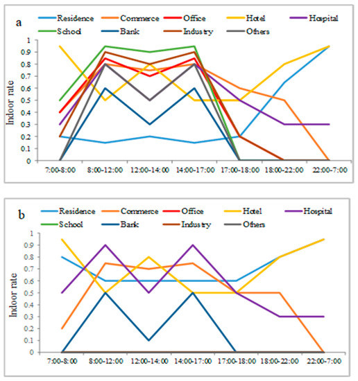 Indoor rate changes in population in different functional buildings. ((a) Workdays; (b) Non–workdays).