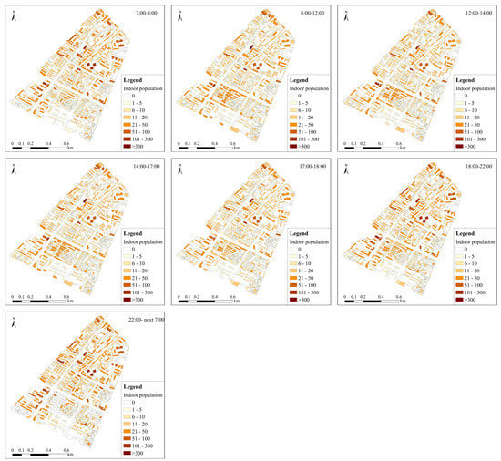 Population exposure is an important element of effective risk analysis and disaster loss assessment [11,63]. High–resolution population spatiotemporal distribution data are of great significance for accurately assessing the risk of trapped people and casualties. Population distributions vary widely over time, especially in metropolitan areas due to human activities. This variation results in different population exposure risks in different buildings during the day. The use function of buildings is one of the key factors affecting the temporal and spatial distributions of urban populations. Unfortunately, the use functions of buildings have rarely been considered in previous research on population spatialization due to the limitation of data availability. In this study, we constructed a model to evaluate the spatiotemporal distribution of indoor populations at the scale of single buildings. This method considers the differences in accommodation population densities among various functional buildings and distinguishes their changes in indoor rates during 24 h of a day. Our study shows that even in the same building, there are great differences in the extent of population exposure in a day. Due to people’s activities, at the same time, the population exposure in buildings with different functions is also significantly different. This can provide an important practical reference for local disaster preparedness and post–disaster emergency response.