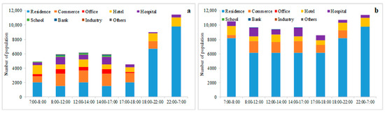 To better distinguish the differences in indoor populations in different functional buildings at different times, Figure 7a,b shows the changes in total indoor population exposure on workdays and non–workdays, respectively. After 6 p.m. on weekdays, the total indoor population showed a significant increasing trend in the study area. Among them, the highest population in the room existed from 22:00 to 7:00, which accounted for approximately 84.36% of the total population. From 17:00 to 18:00 and from 7:00 to 8:00 are the two periods with the lowest number of people in the room, accounting for approximately 33.48% and 36.41% of the total population, respectively. During 8:00–17:00 on weekdays, approximately 43–45% of the total population was in the room (Figure 7a).