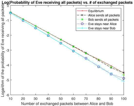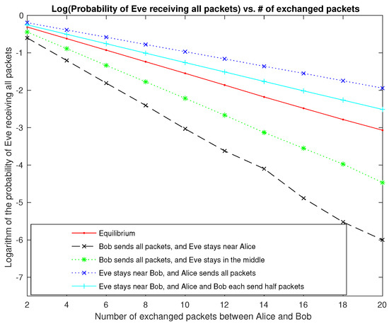 Next, we consider the asymmetric case where it is easier for Eve to receive packets from Alice than from Bob: , , , and . As shown in Figure 2, the number of exchanged packets between Alice and Bob is from 2 to 20 with increment 2 at a time. For each data point, we run the simulation 1 million times, and the probability of Eve receiving all of the packets is calculated the same way as in Figure 1. The vertical axis in Figure 2 is the logarithm of that probability, and five strategies are compared: (1) Equilibrium: This is the pure Nash equilibrium specified in Lemma 4, i.e., Bob sends all of the packets, and Eve stays near Bob; (2) Bob sends all of the packets, and Eve stays near Alice; (3) Bob sends all of the packets, and Eve stays in the middle; (4) Eve stays near Bob, and Alice sends all of the packets; and (5) Eve stays near Bob, and Alice and Bob each send half of the packets. It can be observed that is indeed the Nash equilibrium because both players have no motivation to deviate from it: when Eve stays in the middle or be close to Alice, her probability of receiving all of the packets goes down; when Bob does not send all of the packets, the probability of Eve receiving all of the packets rises.