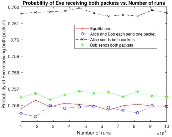 In Figure 3, we show the simulation result of the numerical example above regarding Alice and Bob’s strategies. The horizontal axis is the number of runs that goes from 1 M to 10 M with increment 1 M. The vertical axis is the probability of Eve receiving both packets. Four curves are plotted: (1) Alice and Bob’s strategy at equilibrium; (2) Alice and Bob each send one packet; (3) Alice sends both packets; and (4) Bob sends both packets. We have two observations: (i) Alice and Bob’s strategy at equilibrium converges to utility function value and (ii) all other strategies are not better than the strategy at equilibrium.