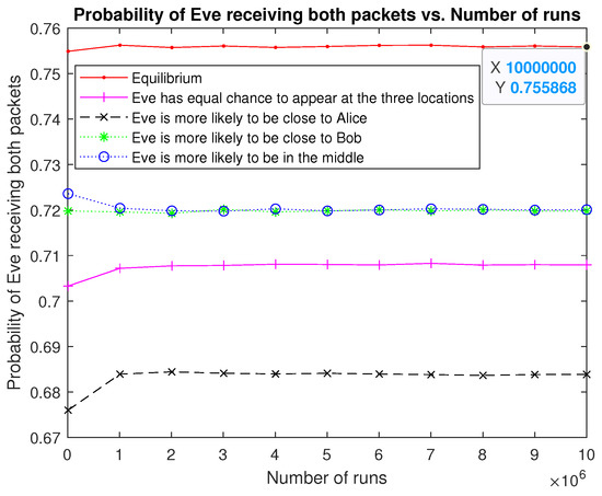 In Figure 4, we show the simulation result of the numerical example above regarding Eve’s strategies. The horizontal axis is the number of runs that goes from 1 M to 10 M with increment 1 M. The vertical axis is the probability of Eve receiving both packets. Five curves are plotted: (1) Eve’s strategy at equilibrium; (2) Eve has an equal chance of appearing at the three locations; (3) Eve has a 50% chance to be close to Alice, a 25% chance to be close to the middle, and a 25% chance to be close to Bob; (4) Eve has a 25% chance to be close to Alice, a 25% chance to be close to the middle, and a 50% chance to be close to Bob; and (5) Eve has a 25% chance to be close to Alice, a 50% chance to be close to the middle, and a 25% chance to be close to Bob. We have two observations: (i) Eve’s strategy at equilibrium converges to utility function value and (ii) all other strategies are not better than the strategy at equilibrium.
