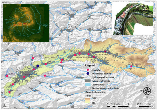 The location of the studied area in relation to the national territory and the hydrographic basin of the Bistrita Ardeleana River.