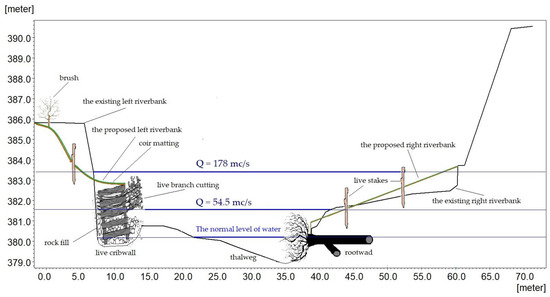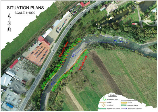 Along the entire length of the hydrotechnical construction proposed for the right bank, live stakes or shrubs can be planted, so that they can increase the effectiveness of the construction in the long term.