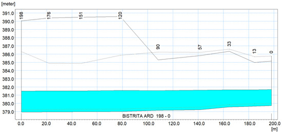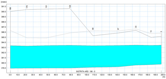 Considering the above, the hydraulic simulations were carried out for two situations in which the flow rates had the values of Q = 54.5 m3/s recorded following heavy rainfall, this being also influenced by the controlled water discharges from the Colibița reservoir and Q = 178 m3/s representing a flow recorded at the Bistrita hydrometric station in 2019, this being the highest flow recorded in the last 15 years [42].