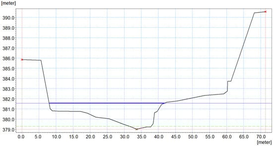 Table 1 shows the mileage of the cross-sections used in the hydraulic simulations to obtain the values of the local parameters. The graphic representation of the transverse profile 6 is used to represent the maximum water level for the two analyzed situations.