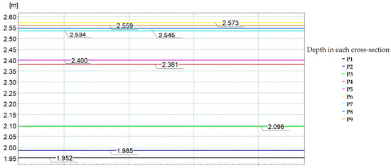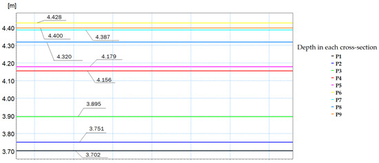 According to the modeling for the flow rate Q = 54.5 m3/s, the water velocity in certain sections can move particles with a diameter close to D50. The rest of the particles with a diameter smaller than D50 for depths greater than 2 m will all be set in motion. In the case of the simulation for the flow rate Q = 178 m3/s, the water velocity can set in motion the particles with a diameter close to D50 only in cross-section 2. In the rest of the cross-sections, the water velocity sets in motion all the particles smaller than D50.