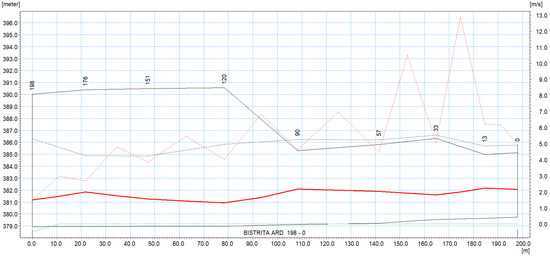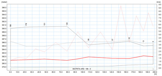 After analyzing the results obtained from the hydraulic modeling for the two flow rates recorded on the Bistrita Ardeleana watercourse, it was observed that for the flow rate of 54.5 m3/s, the unit mass entrainment speeds of the alluvium were below 1.4 m/s and only at a few sections (cross profiles 6–9). For the flow rate of 178 m3/s, unit mass entrainment velocities of alluvium below 1.4 m/s were recorded only in transverse profile 6, the rest having high velocity values.