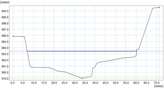 - the broken green line indicates the minimum level in the model, more precisely the minimum depth of 0.3 m taken into account along the entire length of the river sector;