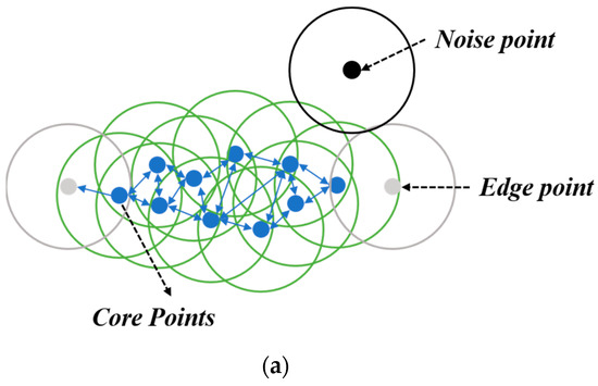 The DBSACN algorithm is a density-based clustering algorithm that can find arbitrarily shaped clusters in a noisy environment and automatically determine the number of clusters [28,29]. The traditional DBSCAN algorithm is shown in Figure 2a. In practical applications, DBSCAN is mainly applied to point clustering and cannot be used for the direct clustering analysis of ship trajectories. Ship trajectory is a set of discrete points, and the lines between the front and back points constitute trajectory segments. The DTW can be used to measure the similarity between trajectories of different lengths [30]. Therefore, in this work, the DBSCAN used DTW as the similarity measure to extend the traditional point-clustering analogy to widely linear clustering, thus extending it to trajectory clustering, as shown in Figure 2b. The main ideas are as follows.
