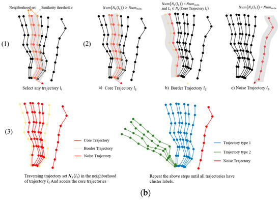 - Traversing the trajectory set in the neighborhood of trajectory : If they are not assigned to a cluster, assign the cluster label of trajectory to them. If they are core trajectories, access their neighborhood trajectories in turn until there are no more core trajectories in the neighborhood. Repeat the above steps until all trajectories have cluster labels.