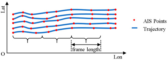 Due to the different acquisition frequencies and time points of the AIS system, the data points contained in the trajectories of the same length are different. In this study, the idea of frame segmentation is adopted to ensure the unity of the points of the subsequent multi-trajectory feature extraction data. The trajectories in the same group are similar. Because of the difference in the sailing speeds and collection times, the frame segmentation in the time domain cannot guarantee the unity of the trajectory points. Therefore, this study adopted the method of spatial domain framing. As shown in Figure 3, the frame length is marked. Since the number of data points in a frame is not constant, the average value of the data in each frame is studied to represent the size of the data in the frame.