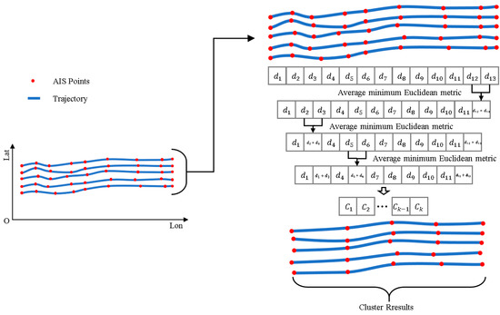 The hierarchical clustering algorithm is also an effective way to extract ship trajectory features. It first determines the number, , of feature extraction points and calculates the Euclidean metric. The average value of the two points from the minimum Euclidean metric is taken to merge [18]. See Appendix A and Figure A2 for detailed steps of the calculation and charts. In addition, some studies have utilized other clustering methods for feature extraction, such as DBSCAN. However, there is currently a lack of research on feature extraction algorithms for trajectory groups.