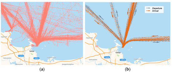 AIS data map of the selected sea area: (a) original data; (b) data after data processing.