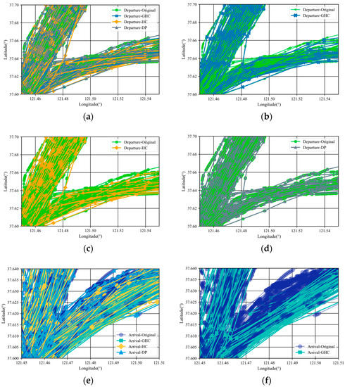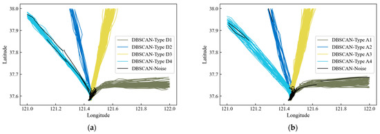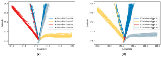 Comparison of the clustering algorithm effects: (a) DBSCAN for the departure trajectory; (b) DBSCAN for the arrival trajectory; (c) K-medoids for the departure trajectory; (d) K-medoids for the arrival trajectory.