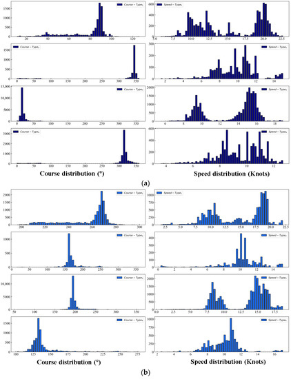 The distribution of the course and speed of four different types of trajectory departures and arrivals is shown in Figure 9. Figure 9a shows the distribution diagram of various characteristics of the departure trajectory. Figure 9b shows the distribution diagram of various characteristics of the arrival trajectory. It can be seen from the clustering results and feature result graphs that the departure and arrival trajectory type 1 was the steering trajectory, and the course and speed had a certain variation trend. In departure trajectory type 1, the course was mainly between 260° and 280°, and speeds of 7 to 12 knots and 17 to 20 knots were more common. In arrival trajectory type 1, the course was mainly distributed between 80° and 100°, and the speed was mainly 9 to 13 knots and 18 to 21 knots. The trajectory types corresponding to other departure and arrival trajectories were straighter, and the course distribution was more concentrated. In most cases, the speed was also relatively concentrated. In the departure trajectory type 2, the course distribution was between 150° and 170°, and the speed distribution was between 9 and 13 knots. In arrival trajectory type 2, the course distribution was between 340° and 350°, and the speed was mainly between 7 and 12 knots. In departure trajectory type 3, the course distribution was between 180° and 200°, and the speed distribution was between 7.5 and 10 knots and between 13 and 17 knots. In the approach trajectory type 3, the course distribution was between 0° and 30°, and the speed was mainly between 8 and 10.5 knots and 13 and 17 knots. In departure trajectory type 4, the course was mainly distributed between 125° and 140°, and the speed was mainly distributed between 7.5 and 12 knots. In arrival trajectory type 4, the course was mainly distributed between 305° and 330°, and the speed was mainly distributed between 7 and 12 knots, with relatively large speed variations.