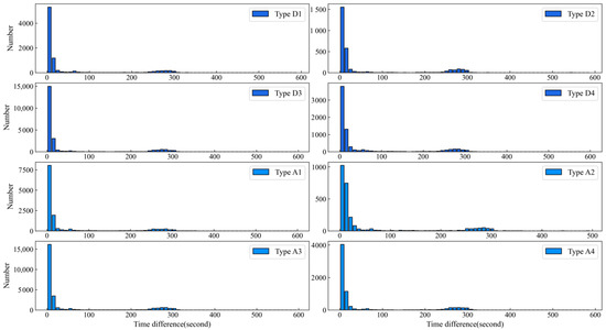 In order to reduce the sensitivity of the trajectory density points and the input data for the subsequent model construction, all trajectory lengths should be guaranteed to be the same. Therefore, this study adopted the method of frame segmentation to process the data. The time difference before and after the trajectory points is shown in Figure 10. As can be seen from the figure, the time difference between the departure and arrival trajectories was mostly concentrated between 0 and 20 s, and a small amount of data was distributed between 200 and 300 s, indicating that there was a certain uneven distribution of the data collection times.