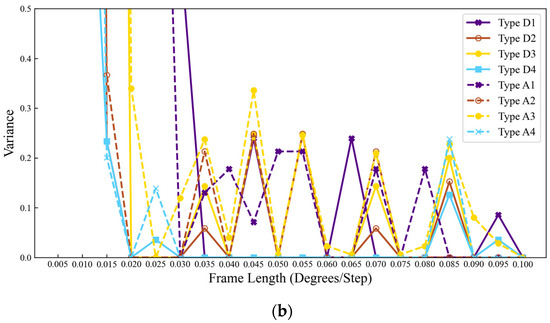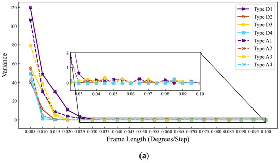 As can be seen from above, frame splitting can ensure that each trajectory had the same trajectory length. In this study, the frame length was set as 0.005° to 0.010°, and the interval was 0.005°. The variance of the number of trajectory points of each trajectory contained by the trajectory group with different frame lengths is shown in Figure 11. We selected the frame length whose variance was 0 for the first time as the frame dividing length. The results of the variance of the different frames are shown in Table 3.The optimal frame length and the number of trajectory points after the framing of each trajectory group are shown in Table 4.