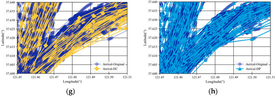 In order to test the algorithm’s performance in the proposed multi-trajectory feature extraction and prediction framework, in this study, the AIS data collected from waters near Yantai Port in Bohai Region of China from January to June 2019 were selected as analysis objects, among which the longitude range was [121.00°, 122.00°] and latitude range was [37.58°, 38.00°]. The reason is that the harbor waters have a variety of trajectory navigation channels, which can be divided into different types of trajectories in the same geographical area. These trajectories are very suitable for testing the overall performance of the proposed algorithm. The selected trajectory is shown in Figure 6. A total of 334 arrival trajectories and 349 departure trajectories were screened. As can be seen from the processed trajectory diagram, different trajectories in the same area had similarities, although there were some differences in the details, and the trajectories had an obvious grouping phenomenon.
