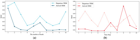 where , and are the query vector, key vector, and value vector, respectively; is the dimension of ; and represents the number of heads of multiple attention mechanisms. From Equations (6) and (7), we can observe that the multihead attention mechanism can be seen as a combination of multiple attention models and as a trajectory information weight distribution scheme, which can allow the model to more fully extract trajectory information during prediction. Finally, the result of the calculation of the output value attention layer is input into the feedforward neural network, and the predicted value of the trajectory point is obtained through linear transformation.
