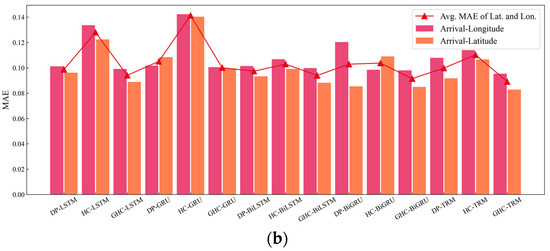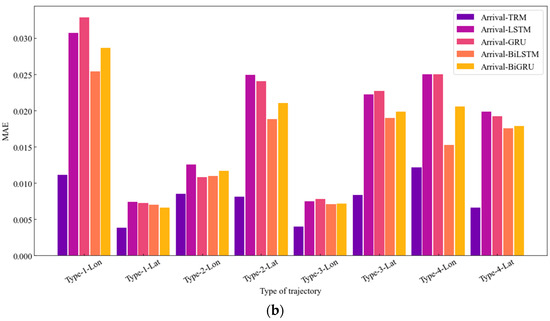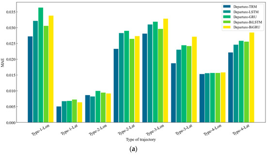 MAE histogram of the different methods combined: (a) comparison of the departure trajectory models; (b) comparison of the arrival trajectory models.