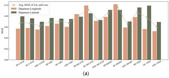 In order to verify the effectiveness of the GHC feature extraction method for model training, this study used the GHC, HC, and DP algorithms for the feature extraction of the same set of data. The data after feature extraction were selected to train different models, and new trajectories were selected for testing. The MAE evaluation indexes of the combination of different feature extraction methods and models are shown in Table 11, and the histogram of the evaluation indexes of the different models is shown in Figure 20. It can be seen from Figure 20 and Table 11 that the combination of features extracted using the GHC algorithm and different models was the best for the MAE compared with other combinations, which indicates that the GHC feature extraction algorithm effectively improves the training effect of the model. It is worth noting that the GHC-TRM combined model achieves the best measure in all the algorithms. This proves the advantages of the GHC-TRM model in the trajectory prediction effect and also proves the feasibility of the multi-trajectory prediction framework proposed in this study for trajectory prediction.