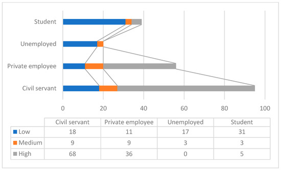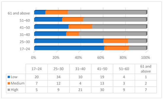 The first analysis is related to the frequency of respondents concerned about autonomous public transportation on the road, based on age and employment status (see Figure 1 and Figure 2).