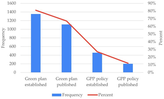 For the construction of the green policymaking initiative scale (i.e., dependent variable), we relied on two important assumptions supported by previous research and discussed in Section 2.2. First, we assumed that planning (i.e., (1) to (4)) is less challenging than the implementation (i.e., (5)) [22,23,24,25]. Second, we ranked publication of the green plans (i.e., (1) to (4)) and/or GPP policy (i.e., (5)) higher, as transparency about green policymaking initiatives counters greenwashing and results in a stronger environmental performance [27,28,29]. Although we are relying on previous research, these assumptions are supported by the distribution of the MOEJ dataset. As shown in Figure 2, an explicit downtrend can be noticed among the municipalities, in terms of the proposed grading dimensions (i.e., planning vs. implementation, and established vs. published). As we move from the more discretionary condition (i.e., green plan established) to the more demanding condition (i.e., GPP policy published), we notice a decreasing number of municipalities fulfilling the more stringent requirements.