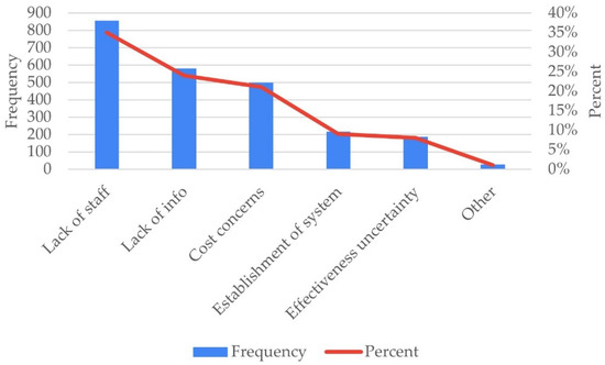 RQ2 investigates the municipalities that scored relatively low for green policymaking initiatives. More concretely, we considered the municipalities that did not establish (and publish) a GPP policy. This concerns the municipalities that did not score higher than 3 on the green policymaking initiative scale (see Section 4.3). In practice, these municipalities were not involved in green initiatives (i.e., 1 point) or could only fulfill the rather discretionary condition of having a green plan established (i.e., 2 points) and published (i.e., 3 points). In summary, for RQ2, we examined how municipalities can move towards the more demanding condition of having a GPP policy established and published. For the municipalities without a GPP policy, the MOEJ survey provides data on potential barriers and enablers, as shown in Table 6 and Table 7, respectively.