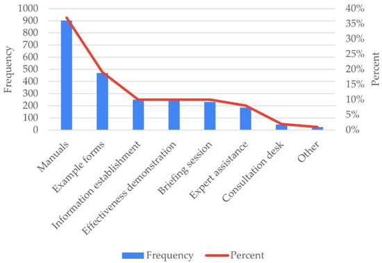 As enablers, several studies support the development of tools to assist local authorities [59]. Manuals with procedures or example forms with specifications can help municipalities in establishing GPP [12,52,53,54]. Other enablers might be expert assistance or a consultation desk. Testa et al. [33] argued that external assistance might be valuable to identify the juridical boundaries of the tender, to choose the correct and most appropriate modalities, and to articulate the corresponding technical criteria. Additional external knowledge might also come from other local governments having a successful GPP strategy [31]. Finally, GPP briefing sessions for local government officials might be another enabler, as these can produce similar benefits to those of training sessions [31,46,47,48,49,50].