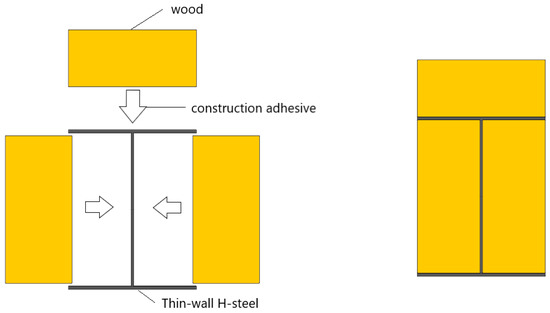 According to the literature review, a new type of rectangular-section combination beam from welded thin-walled steel H-beam/camphor pine was studied. The combination beam of three thin-walled steel plates was welded into an H-type skeleton by argon arc. The sides of the upper flange and web were covered with pine wood using strong epoxy resin AB glue in the rectangular section combination beam. The section of this combined beam is shown in Figure 1.