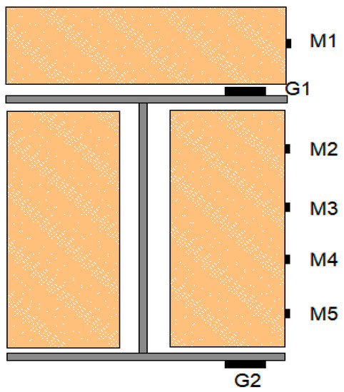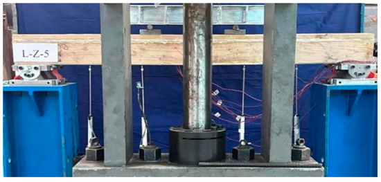 The test adopts the controlled displacement loading method. The speed was 1 mm·min−1 and held the load for two minutes to read the number of each instrument. Five linear displacement sensors were arranged on the lower side of the beam in the upper flange middle on the side of the wood with M1, and the web with four sheets M2, M3, M4, and M5. The two strain sheets were adjusted at the edge of the upper and lower flanges of the H-shape steel, numbered G1 and G2. The DH3816 static strain measurement system was used to collect the data. The strain sheets were arranged as shown in Figure 3. The field of loading is shown in Figure 4.