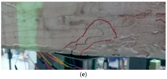 The beams L-Z-1~L-Z-5 showed similar destructive forms, and the final brittle fracture in the wood on both sides of the H-type steel web reached the ultimate tensile strength. It made the combined beam ineffective. The L-Z-2 composite beam is taken as an example for analysis. At the beginning of loading, the L-Z-2 combination beam was deformed with an increase in the load. When the load measurement showed 35.07 kN, the “click” sound of the wood fiber inside the composite beam and the “crackling sound” of degassing was heard for the first time. The greater the load, the denser and the louder the sound. After the load of 45.19 kN, the primary crack occurred at the right end of the specimen and gradually extended to the span of pure bending (Figure 5a). Figure 5b shows the left end of the composite beam in this stage. When the load value represented 49.31 kN, the crack was gradually enlarged (Figure 5c). As the load reached 56.47 kN, the composite beam entered the elastic–plastic step. The upper flange alongside the right side of welded steel H-beam web is shown in Figure 5d. When the load measurement represented 59.72 kN, there was a ‘loud bang’ in the zone of the lower flange of the steel H-beam. The lower flange of the steel H-beam reached the yield strength toward the outside, and the steel bent. Therefore, the 45° inclined crack took place in the wood in the same position (Figure 5e), and the composite beam was damaged.