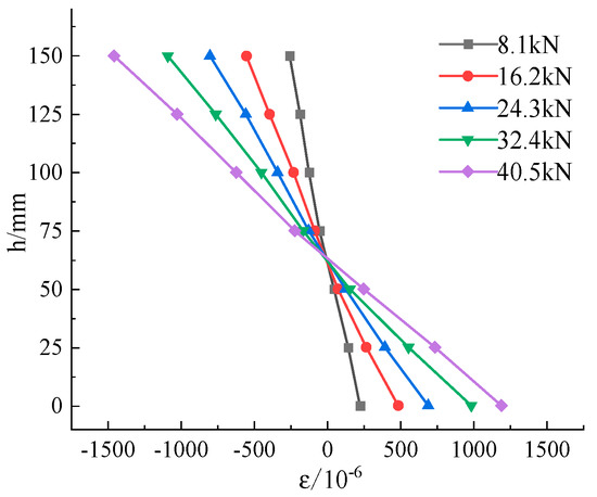 Cross-section strain curves across L-Z-2 are shown in Figure 6. The maximum component load value in the figure was taken as the corresponding yield load. The strain value above the neutral axis was negative, indicating that the section above the neutral axis was pressed under the load, making the strain sheet and the value to be negative. The strain value below the neutral axis was positive, indicating that the section below the neutral axis was pulled under the load. It straightened the strain sheet, and the value was positive. The position of the neutral axis in the pure bend section of the component was always unchanged throughout the whole process from the initial load to the yield load, representing that the high-strength epoxy AB glue connection was effective.