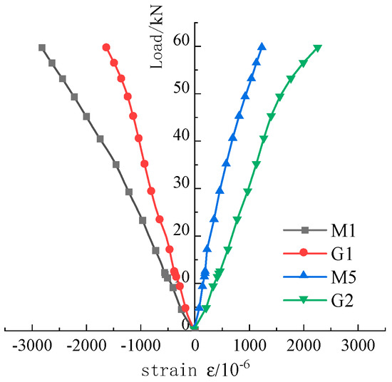The cross-sectional load–strain curve for the combined beam L−Z−2 is shown in Figure 7. The values of the left strain abscissa half-axis were negative, representing the sticking position of the strain sheets M1 and G1 in the compression area of the member. The values of the right strain abscissa half-axis were positive, indicating the sticking position of the strain sheets M5 and G2 in the tensile area. From the figure, the strain measurement of each point in the section increased proportionally from the initial load to the yield load. The strain between the pressure area and tensile region was almost symmetric around the ordinate. The strain change of steel and wood in the tensile and compression areas was almost synchronized, showing a very reliable glue connection between the steel and wood. Furthermore, the two deformations could work together, and the combined effect was significant. Furthermore, the value of strain G1 in the compression area was higher than that of M1 in the compression area. It indicated that the steel–wood combination beam played a complete role in the bending test of the steel.