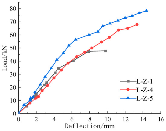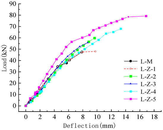 The load–span median deflection diagram of the L-M, L-Z-1~L-Z-5 specimens are shown in Figure 9. The test period from the loading beginning to the failure was divided into three steps: elastic stage, elastic–plastic step, and destructive stage. Among the samples, the whole stress process of specimens L-M and L-Z-5 was the most representative. In the elastic step, the welding of the wood from the thin-walled H-shape steel and the left and right sides of the web, and the wood at the upper flange, under the strength of the high-strength binder, made the span deflection show an increasing linear trend with the load enhancement and always remained linear before the yield load of the component. The adhesive cracking started when the load exceeded the strength of the binder. At the same time, the welded thin-walled H-shape steel began to yield and entered the elastic–plastic stage. From the figure, there was a clear yield platform, after which the slope of the curve started to decrease and became nonlinear. It meant that the bending stiffness of the component gradually decreased, and the carrying capacity began to decrease. A gradual increase in the load caused a gradual reduction in the stiffness, which entered the destruction step. With an equal amount of load, the deformation expanded deflection rather than in the previous stage. When the load increased gradually, the component was damaged. According to the load–span medium deflection diagram, the final deflection of the member L-M was about 8 mm, and the final damage phenomenon indicated a brittle failure. The final deflection of the remaining combined components exceeded the final deflection of the components L-M, and the final damage phenomenon occurred as ductility damage. The component L-Z-5 was a typical representative component of ductile failure, and its final deflection was 16.87 mm, which also represented that the component delayed the damage when the steel was in the destructive stage. This kind of combined beam resulted in a good deformation ability and ductility under the bending process.