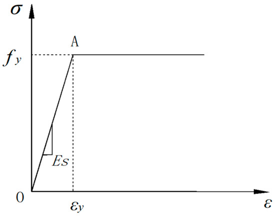 The failure of the combined beam was due to the failure of the wood on both sides of the H-shape steel web after reaching the tensile strength, and the steel failed to play the ultimate tensile strength role. The steel conformed to the ideal elastic–plastic model. Its constitutive relationship is shown in Figure 13.