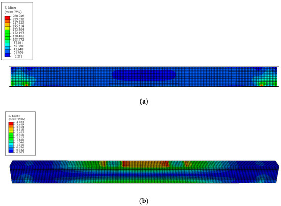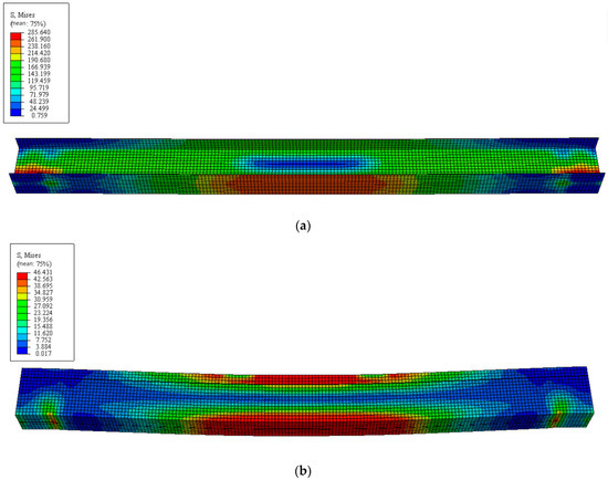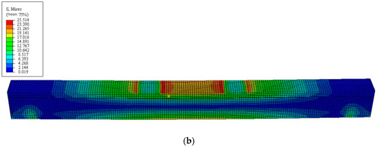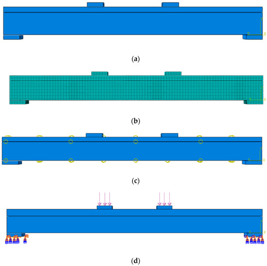 This paper uses the overall combination beam as the research object, and the connection between the components is not the focus of this paper. The connections at different sites used the “Tie” binding constraints. The connection of each part was made to achieve the purpose of common force and coordinated deformation. After the interface, the interaction is shown in Figure 15c.
