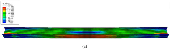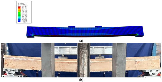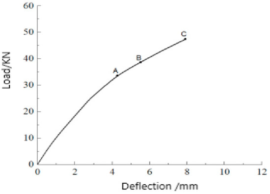 Figure 16 shows a comparison of the overall deformation stress cloud map of the combined beam and the test damage map. From Figure 16, the two deformations and damage were consistent. Figure 17 shows the load–span deflection curve of the ABAQUS simulation member L-Z-1. Three points A, B, and, C are important nodes during loading. A indicates how well the lower flange at the steel pad just reached its yield. At this time, the wood at the upper flange of the steel H-beam and the wood on both sides of the steel H-beam web did not approach the yield strength. Point B was that after the upper and lower flanges of H-shape steel reached the yield strength, the wood at the upper flange of H-shape steel approached the tensile yield strength, and the wood tensile area on both sides of the H-shape steel web did not reach the tensile yield strength. At point C, both the upper and lower flange and the web of the H-shape steel approached the yield strength, and the wood at the upper flange reached the smooth grain compressive yield strength. At the same time, the wood tensile area on both sides of the H-shape steel web approached the tensile yield strength.