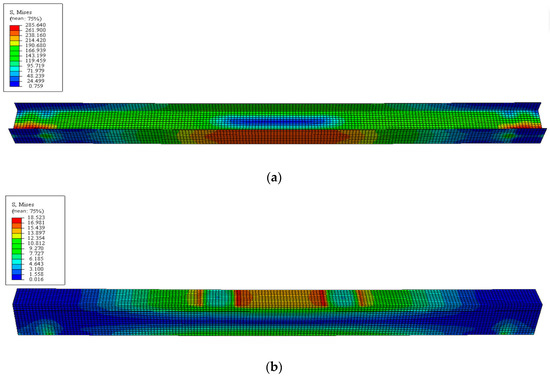 Figure 19 represents a cloud diagram of the stress distribution for the H-type steel and wood at point A. At point A, the H-shape steel webs of the lower flange span of the H-shape steel and the support pad also reached the yield strength of the steel, and the stress was 285.60 MPa. At this time, the wood at the upper flange and the wood on the sides of the steel H-beam web did not reach the yield strength, the maximum compression stress at the wood pad at the upper flange was 18.52 MPa, and the maximum compression stress on the sides of the steel H-beam web was approximately 7.73 MPa. The maximum tensile stress of the wood area on both sides of the H-type steel web was about 13.90 MPa.