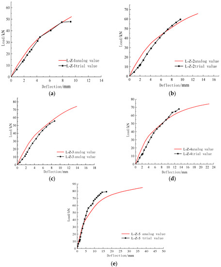 The comparison of the curves of combined beam load–span medium deflection for (a) L-Z-1; (b) L-Z-2; (c) L-Z-3; (d) L-Z-4; (e) L-Z-5.