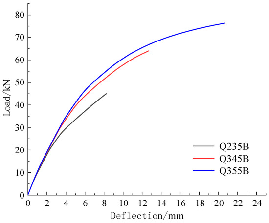 The yield strength of steel types Q235B, Q345B, and Q355B was selected for simulation. The remaining parameters of the combined beam remained unchanged, and the load–cross range deflection curve is shown in Figure 24. In the elastic range, the three curves almost coincided. When the yield strength increased from Q235B to Q345B, the carrying capacity was enhanced by 42.22%. When the yield strength increased from Q345B to Q355B, the carrying capacity was enhanced by 19.22%. Therefore, the bending bearing capacity increased with the yield strength, but the load enhancement rate showed a gradually decreasing trend. Although the yield strength of steel improved the bearing capacity to a certain extent, the improvement rate in the bearing capacity gradually became smaller.
