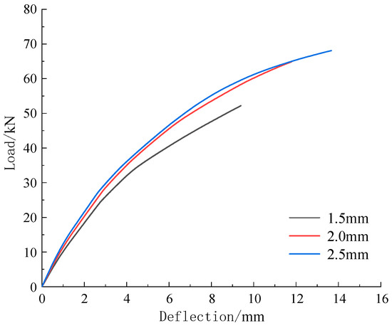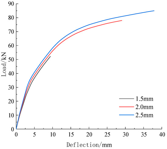 The values of 1.5 mm, 2 mm, and 2.5 mm were considered to study the H-type steel thickness influence on the bearing capacity of the combined beam. A comparison diagram of the load versus deflection is shown in Figure 26. According to the figure, the increase in the maximum bearing capacity was smaller. The maximum bearing capacity of the combined beam with a web thickness of 1.5 mm and 2 mm was 52.20 kN and 64.86 kN, respectively. The maximum bearing capacity increased by 24.25%. The load-deflection curve of the combined beam with a web thickness of 2 mm and 2.5 mm was very close, the deformation trend was consistent, and the maximum bearing capacity increased by 5%. From the perspective of the steel quantity of H-shape steel, the thickness of the web was adjusted from 1.5 mm to 2 mm, the steel volume increased by 33.33%, the maximum bearing capacity was enhanced by 24.25%, the steel volume increased by 1%, and the maximum bearing capacity was enhanced by 0.73%. When the thickness of the web was changed from 2 mm to 2.5 mm, the steel volume increased by 25%, and the maximum bearing capacity was enhanced by 5%. The amount of steel used increased by 1%, and the maximum bearing capacity was enhanced by 0.2%. Consequently, the thickness of the H-type steel web was 2 mm as the optimized web thickness.