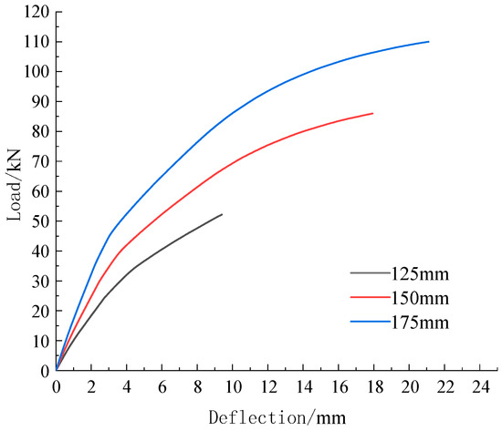 The effect of the three web heights of 125 mm, 150 mm, and 175 mm was investigated on the bearing capacity of the combined beam. The curve of load–span medium deflection is shown in Figure 27. According to the figure, with a gradual increase in the height of the H-shape steel web, the maximum capacity of the corresponding combined beam was enhanced significantly. The height of the web increased from 125 mm to 150 mm, and the maximum bearing capacity was enhanced by 64.56%. The height of the H-shape steel web increased from 150 mm to 175 mm, and the maximum bearing capacity was enhanced by 27.93%. The maximum bearing capacity of the combined beam was analyzed from the amount of type steel. When the height of the H-type steel web increased from 125 mm to 150 mm, the amount of steel H-beam of the composite was enhanced by 20.49%, the maximum bearing capacity increased by 64.56%, the amount of H-shape steel was enhanced by 1%, and the maximum bearing capacity increased by 3.15%. When the height of the H-type steel web was enhanced from 150 mm to 175 mm, the amount of H-type steel for the combined beam increased by 17.00%, the maximum bearing capacity was enhanced by 27.93%, the amount of H-type steel increased by 1%, and the maximum bearing capacity was enhanced by 1.64%. Finally, an increase in the height of the H-shape steel web significantly improved the bearing capacity of the combined beam, and the optimum web height should be 150 mm.