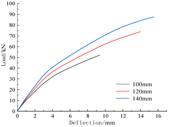 The influence of setting the width of 100 mm, 120 mm, 120 mm, and 140 mm was studied. The curve of load–span deflection is shown in Figure 29. The three curves resulted in the same trend. As the width of the combined beam gradually increased, the maximum carrying capacity occurred. The width of the combined beam was enhanced from 100 mm to 120 mm, corresponding to the maximum bearing capacity increased by 17.86 kN. It was enhanced by 34.21%. The width of the combined beam increased from 120 mm to 140 mm, corresponding to the maximum bearing capacity of 17.64 kN, and was enhanced by 25.18%. Therefore, the maximum bearing capacity increased step-by-step with the width of the combined beam.